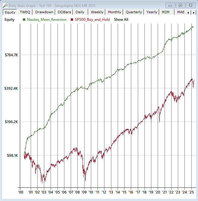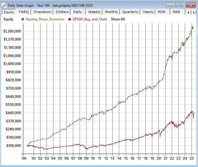 A calm but highly profitable Nasdaq-focused mean reversion strategy captures short-term pullbacks in stable, large-cap tech stocks.